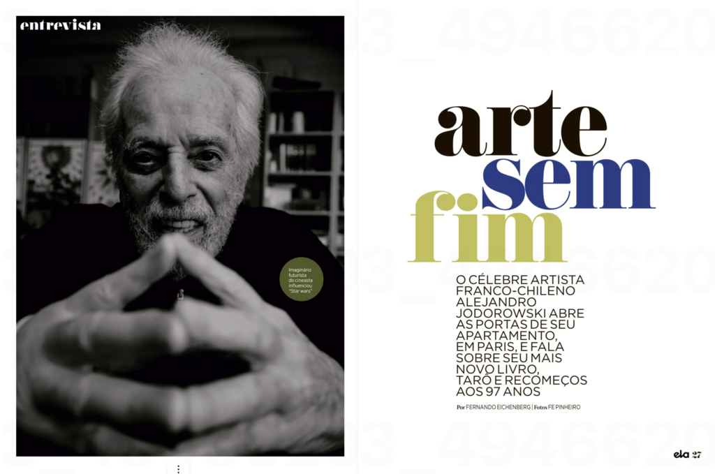 No decorrer da conversa, Jodorowski sugere uma leitura de tarô ao entrevistador, que, obviamente, não refuta o convite. Ele explica com paciência, atenção e um entusiasmo juvenil os significados da simbologia de cada carta tirada. O infatigável artista não pretende se aposentar. Em sua agenda, estão previstas viagens próximas para compromissos em Sevilha e Nova York, além de novos projetos artísticos com os museus francês Centre Pompidou-Metz e italiano Maxxi, em Roma. Ao mesmo tempo, desenvolve sua nova proposta de uma experiência artística aliando a intimidade da leitura ao imaginário visual do cinema; e prepara um novo livro, sobre a “psicotranse”, um passo além no processo criativo de sua “psicomagia”. Sobra ainda espaço para suas reflexões sobre o humano e a vida postadas em todos os domingos na rede social X, onde tem quase 2 milhões de seguodores.